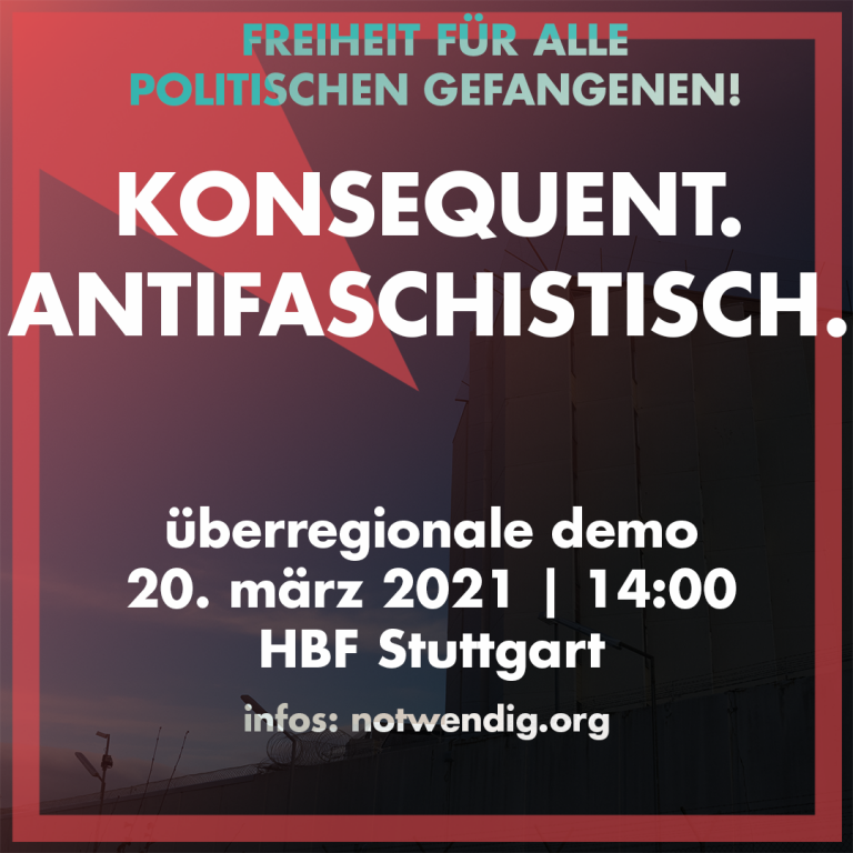 Für genau solches, konsequentes Handeln soll den Antifaschisten Jo und Dy im Frühjahr 2021 in Stuttgart der Prozess gemacht werden. Beiden wird vorgeworfen an einem Angriff auf Nazis der rechten Scheingewerkschaft „Zentrum Automobil“ am Rande einer Querdenken-Demo in Stuttgart beteiligt gewesen zu sein, bei dem einige Nazis zum Teil schwer verletzt wurden.