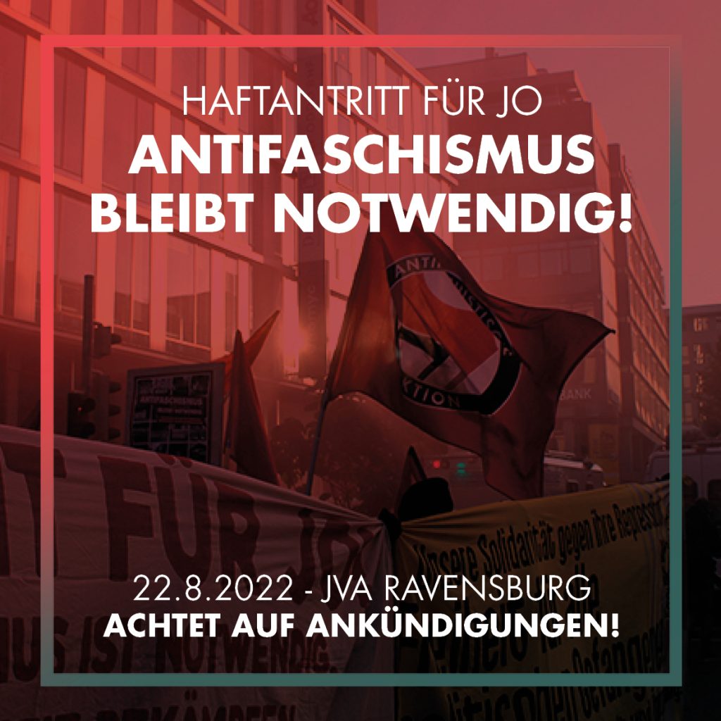 Diesen Anlass werden wir nicht unkommentiert lassen! Es ist klar, dass Jo nicht alleine nach Ravensburg fahren wird. Wenn dieser Staat uns unsere Genoss:innen nimmt, sie für Jahre einkerkert und versucht, diese so zu brechen, zu isolieren und aus dem politischen Prozess draußen herauszutrennen, dann dürfen wir das nicht zulassen. Gerade dann gilt es einerseits, den Kampf unserer Gefangenen, das konsequente Vorgehen gegen Rechte und Faschos fortzuführen und weiterzuentwickeln, andererseits auch sie nicht zu vergessen und die politische Isolation des Knastes bestmöglich zu durchbrechen.