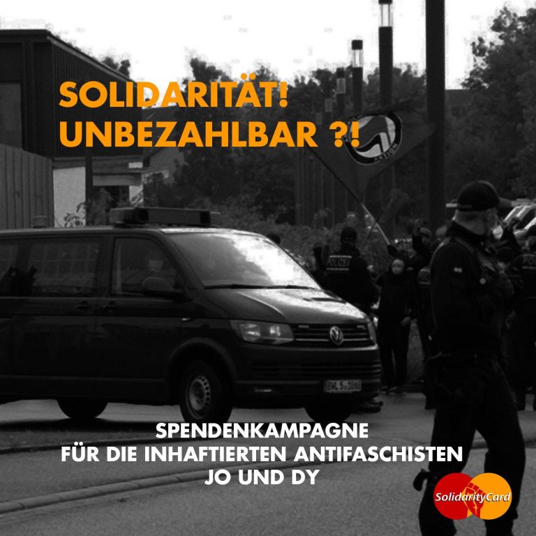 Auch wenn die beiden Antifaschisten stellvertretend für uns als Bewegung in Knast müssen, können wir ihnen zumindest die Kosten abnehmen. Helft mit und spendet für Jo & Dy, auch wenn es nur ein kleiner Betrag ist, denn: Antifaschismus bleibt notwendig! Freiheit für Jo und Dy!