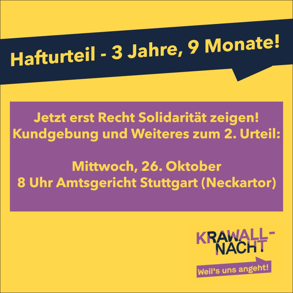 Weiterlesen: 1. Urteil zu 3 Jahren 9 Monaten Haft – Alle zur Solikundgebung am 26.10.Ab 8 Uhr gibt es vor Gericht eine Kundgebung mit Infotisch, Reden und weiterem Programm zur solidarischen Begleitung. Auch soll der nicht stattgefundene Stadtspaziergang „Auf den Spuren der Krawallnacht“ nachgeholt werden.