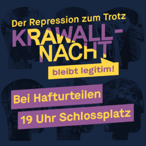 Weiterlesen: Bei Hafturteilen: Kundgebung!Die unzähligen Haftstrafen im Nachgang der Krawallnacht und die repressiven Maßnahmen sollen nicht nur den Kontrollverlust des Staates rächen, sie zielen im Fall der beiden angeklagten Aktivist:innen auch auf eine revolutionäre Linke, die sich nicht von der Realität der Menschen distanziert, sondern versucht sie aufzugreifen und zu politisieren.