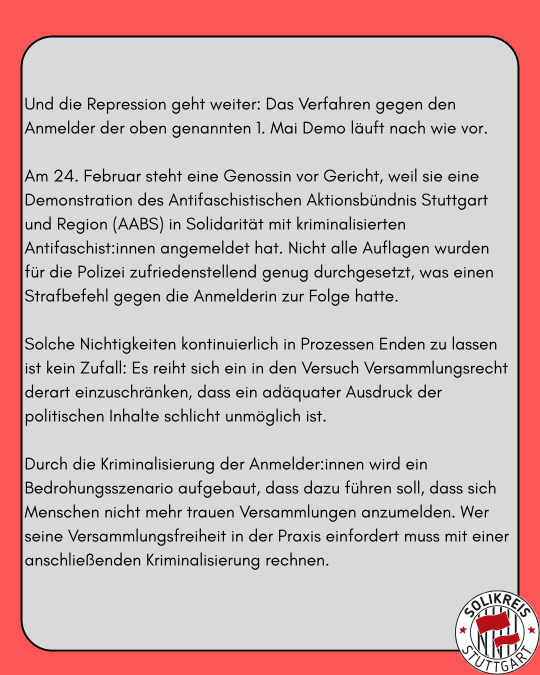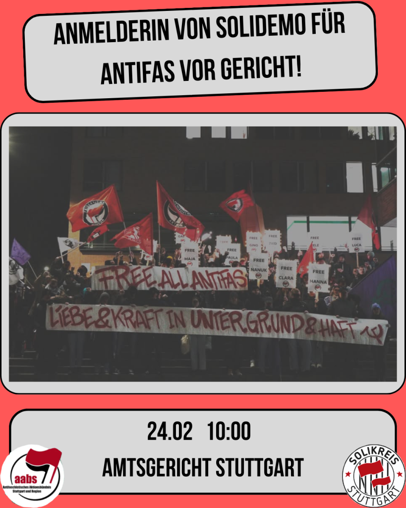 Am 24. Februar steht eine Genossin vor Gericht, weil sie eine Demonstration des Antifaschistischen Aktionsbündnis Stuttgart und Region (AABS) in Solidarität mit kriminalisierten Antifaschist:innen angemeldet hat. Nicht alle Auflagen wurden für die Polizei zufriedenstellend genug durchgesetzt, was einen Strafbefehl gegen die Anmelderin zur Folge hatte.