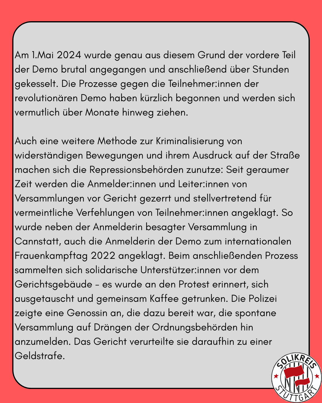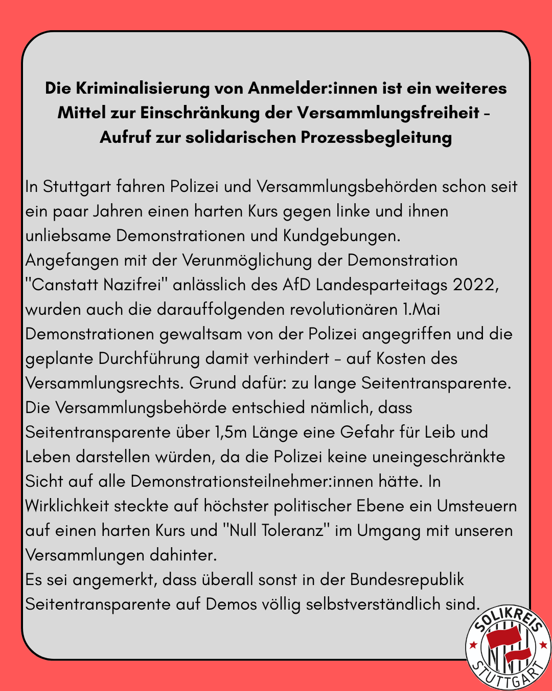 Weiterlesen: Kriminalisierung von Anmelder:innen als weiteres Mittel zur Einschränkung der Versammlungsfreiheit – Aufruf zur solidarischen ProzessbegleitungAngefangen mit der Verunmöglichung der Demonstration „Canstatt Nazifrei“ anlässlich des AfD Landesparteitags 2022, wurden auch die darauffolgenden revolutionären 1.Mai Demonstrationen gewaltsam von der Polizei angegriffen und die geplante Durchführung damit verhindert – auf Kosten des Versammlungsrechts. Grund dafür: zu lange Seitentransparente.