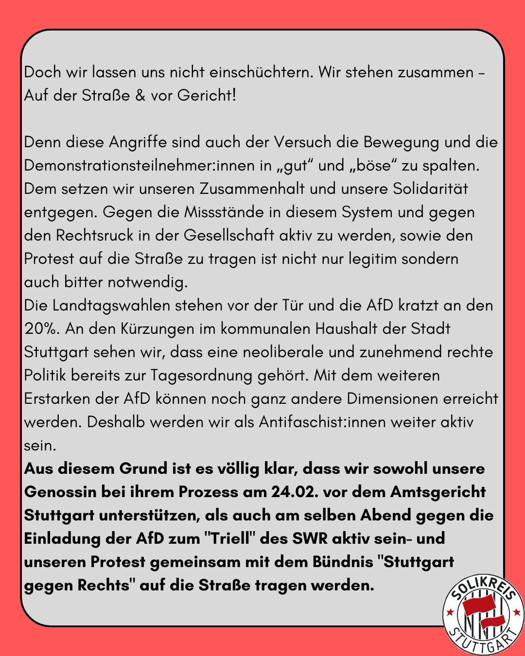 Aus diesem Grund ist es völlig klar, dass wir sowohl unsere Genossin bei ihrem Prozess am 24.02. vor dem Amtsgericht Stuttgart unterstützen, als auch am selben Abend gegen die Einladung der AfD zum „Triell“ des SWR aktiv sein- und unseren Protest gemeinsam mit dem Bündnis „Stuttgart gegen Rechts“ auf die Straße tragen werden.