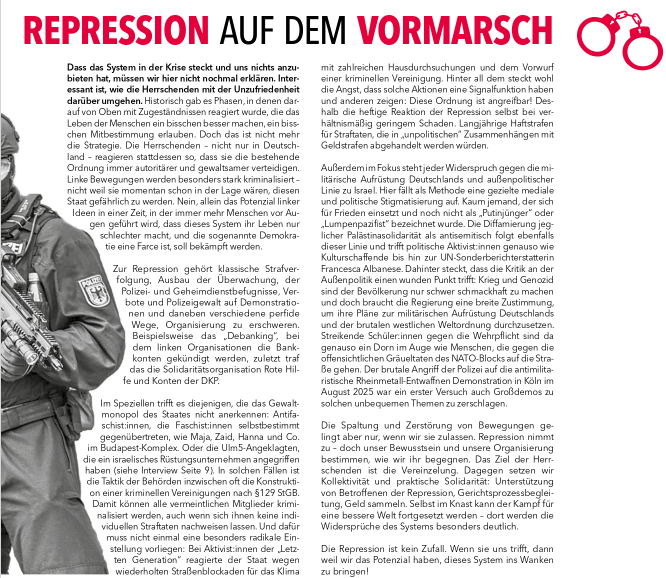 Im ersten Text wird die zunehmende Repression gegen fortschrittliche Bewegungen und all jene die sich gegen Aufrüstung, Rechtsentwicklung und Kriege einsetzen thematisiert: