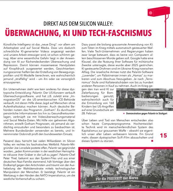 Desweiteren gibt es einen Artikel mit dem Namen „Überwachung, KI und Tech-Faschismus“. Inhaltlich wird hier auf die Überwachung durch künstliche Intelligenz, die Macht großer Technikkonzerne und die Gefahren durch Software wie Palantir eingegangen: